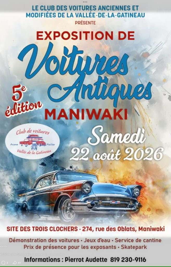 Exposition de voitures de Maniwaki samedi le 22 août 2026